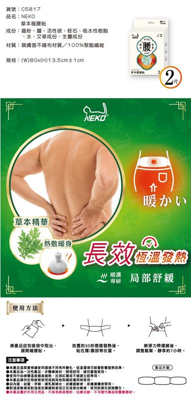隆藝.巧巧.金獎【台南南吉五金】C5817 NEKO草本暖腰貼(2入)