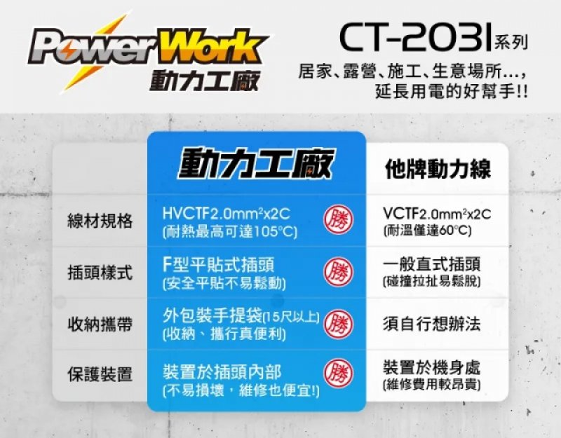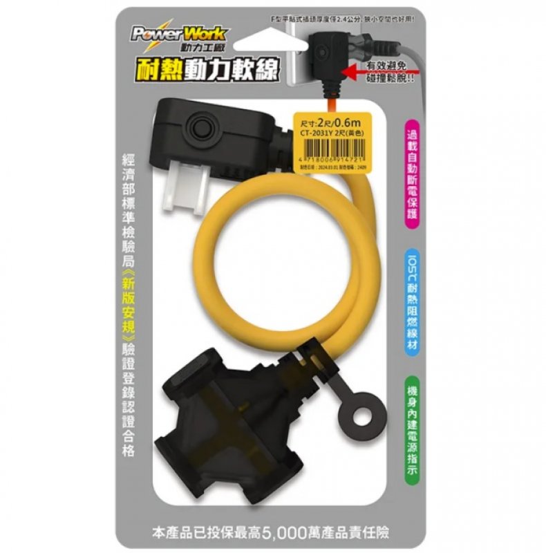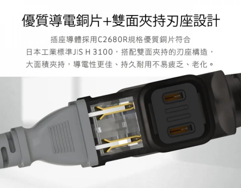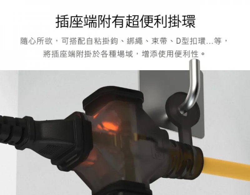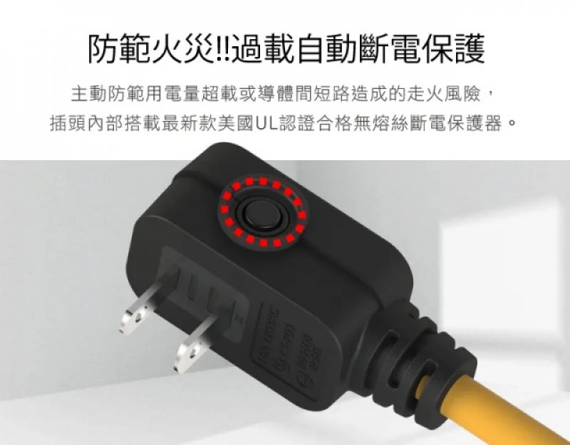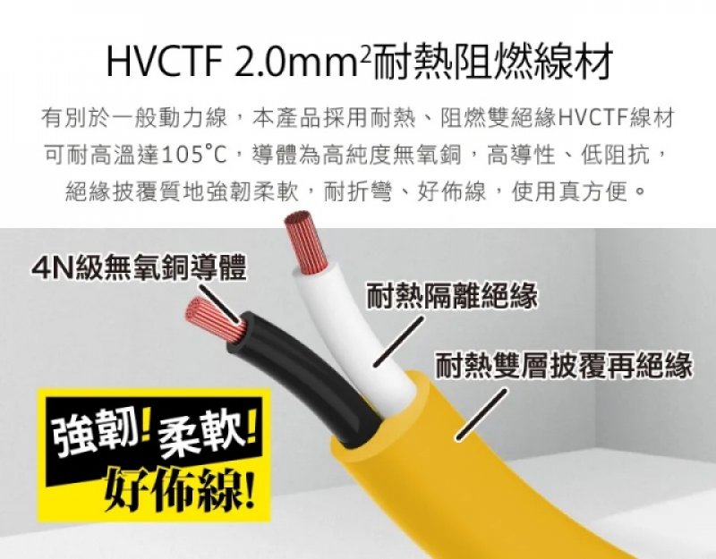 F型平貼式插頭、無熔絲過載自動斷電保護、高耐熱防火材質絕緣支架、大面積夾持式刃座構造、高導率4N級無氧銅+雙絕緣105°耐熱線材、機身內建電源指示燈、插座端附有超便利掛環。